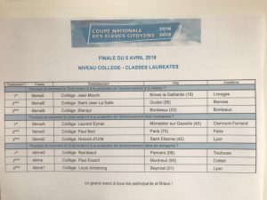 FINALE DU 5 AVRIL 2019 COUPE NATIONALE DES ELEVES CITOYENS 2019 – CLASSES LAUREATES
