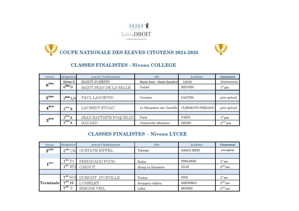 Finale de la Coupe Nationale des Élèves Citoyens 2024-2025 16 avril 2025 / La vie de l'asso Share Tweet Share La finale de la Coupe Nationale des Elèves Citoyens s’est tenue au CESE le 3 avril 2025. Découvrez le palmarès des classes lauréates !