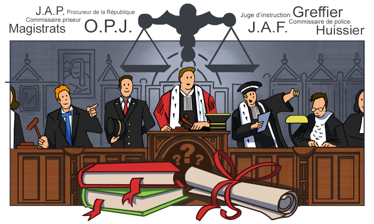 MAGISTRATS– Rôle : il existe de nombreux juges différents (juges pour enfants, aux affaires familiales, de l’application des peines…).Globalement, le juge doit rendre un jugement en toute impartialité, en appliquant la loi.Pour cela il étudie le dossier qui lui est confié, interroge les victimes/les accusés et leurs avocats respectifs, peut ordonner des enquêtes pour trouver des preuves supplémentaires, organiser des reconstitutions… – Formation : il faut avoir au moins un Master 1 en droit, c’est-à-dire avoir suivi au moins 4 ans d’étude en faculté de droit pour pouvoir passer le concours d’entrée (extrêmement sélectif) à l’école de formation à la profession de magistrat, l’Ecole Nationale de la Magistrature (ENM) de Bordeaux. La formation à l’ENM dure ensuite 31 mois.– Salaire minimum : Variable selon le domaine (famille, instruction etc.) mais rarement inférieur à 2000 euros/mois. |